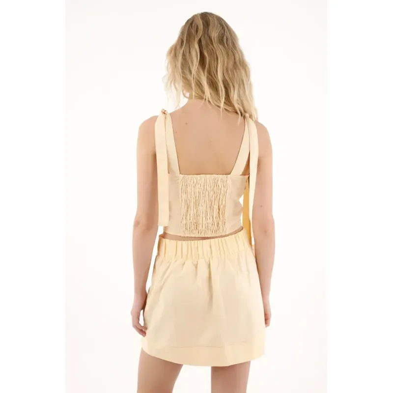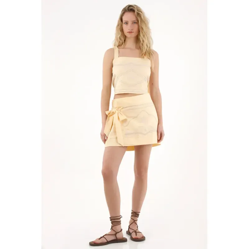 Diseño cropped con escote recto, tiras ajustables y detalle de imitación bordado en delantero; llévala en set con falda y recrea el look más auténtico de la temporada.
