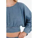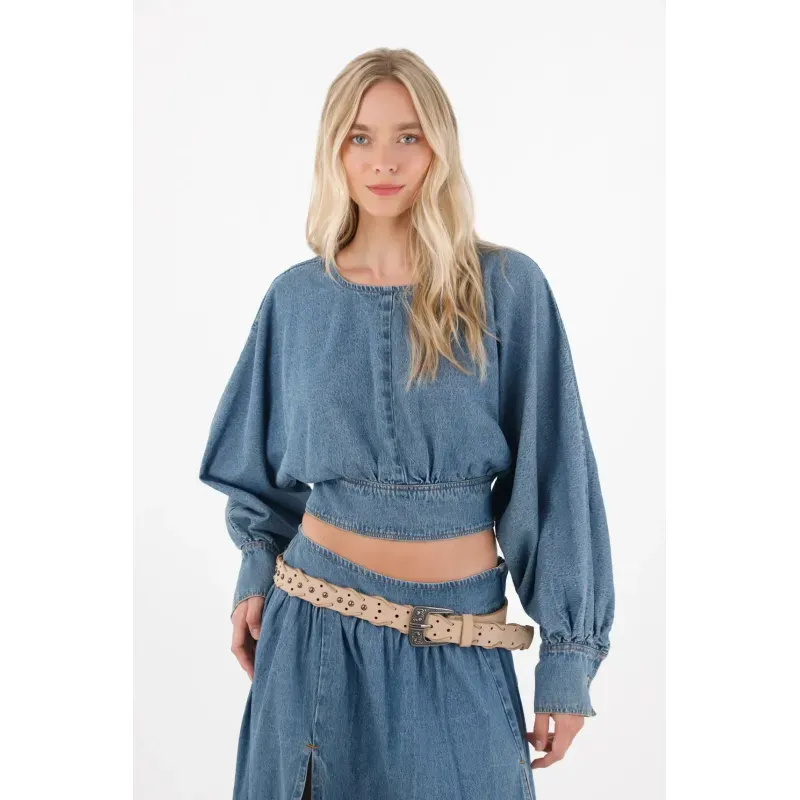 Confeccionada en denim liviano tono medio, silueta crop que estiliza y manga larga con puños ajustables con botones y fajón integrado que define la cintura y permite versatilidad en el styling.
