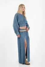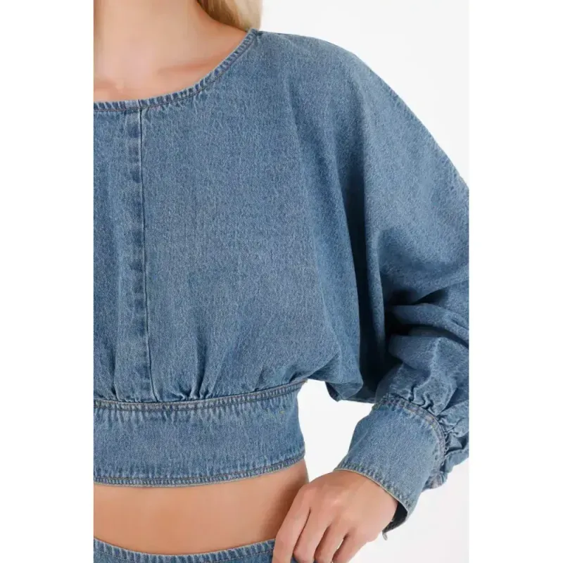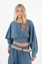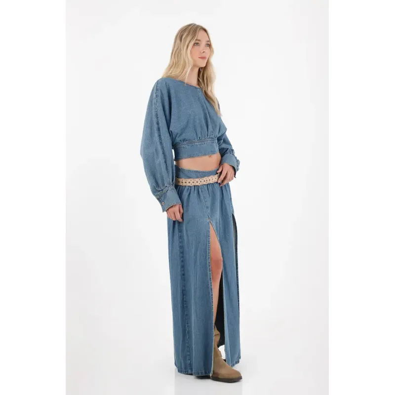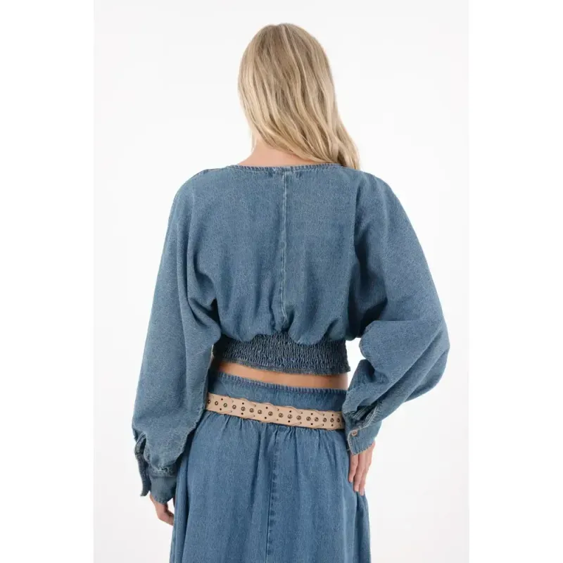 Esta camisa crop en denim liviano es tu aliada para crear looks urbanos con actitud. Sus mangas largas con volumen y el fajón en la cintura permiten jugar con siluetas y proporciones: combínala con una falda larga para un set armonioso o con tus jeans favoritos para un look casual-chic. Añade accesorios o unos tenis deportivos para un toque contemporáneo que no pasará desapercibido.