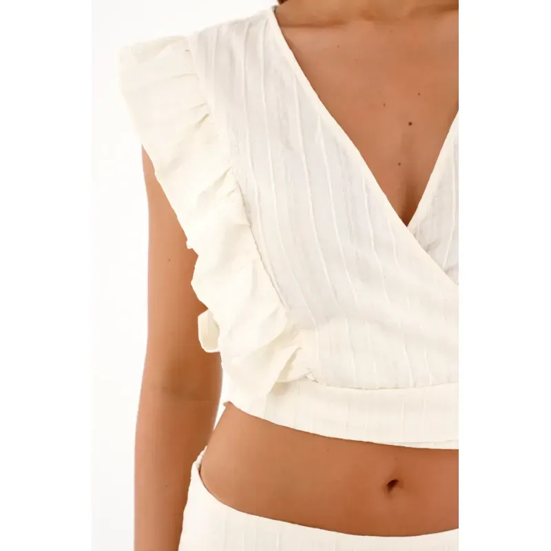 De silueta crop y manga sisa, confeccionado en tela ligera, ofrece frescura y comodidad con un aire effortless.
