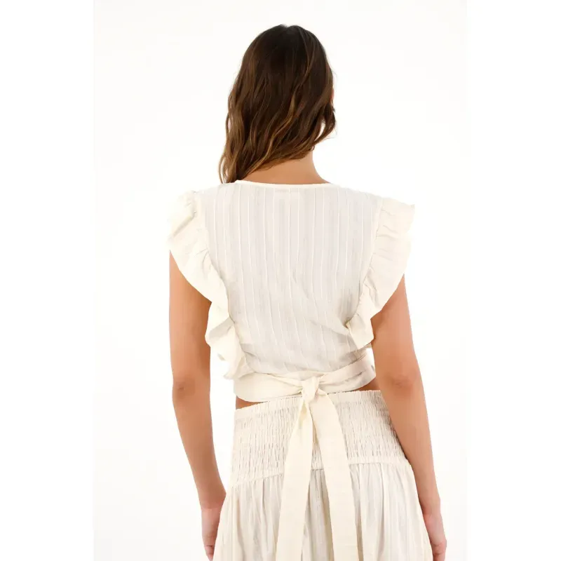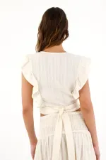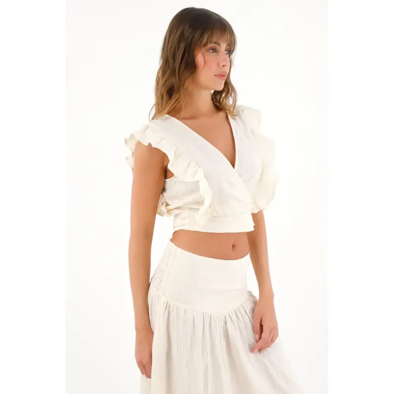 Con ese mix perfecto entre romantic vibes y silueta trendy, este crop ya se robó tu corazón. El escote profundo en V y los boleros que recorren el delantero y posterior crean un efecto femenino y sofisticado, mientras la tira que anuda en el fajón suma un detalle de diseño versátil que ajusta y estiliza.