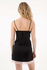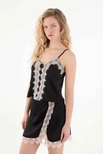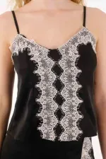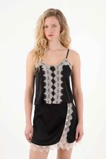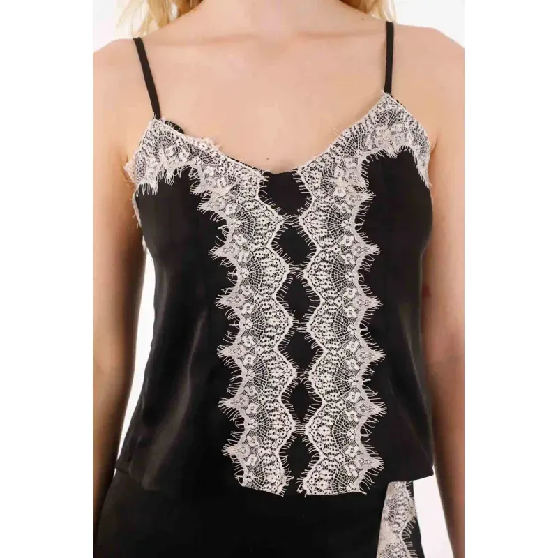 Esta camisa en tono negro combina sencillez y encanto gracias a su escote en V decorado con delicados detalles de encaje. Sus tiras delgadas aportan un aire fresco y elegante, mientras la perilla con botones falsos crea un acabado limpio y sofisticado. Una prenda versátil que puedes usar sola o en set con su falda a juego para lograr un look armonioso y moderno.