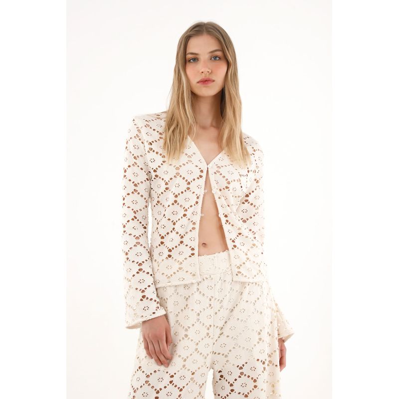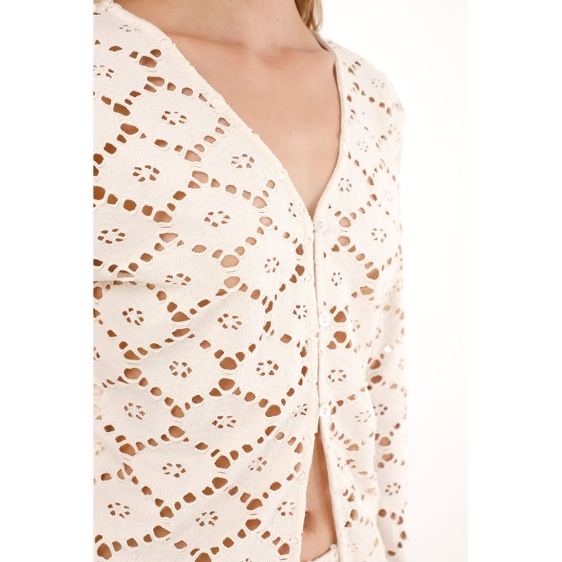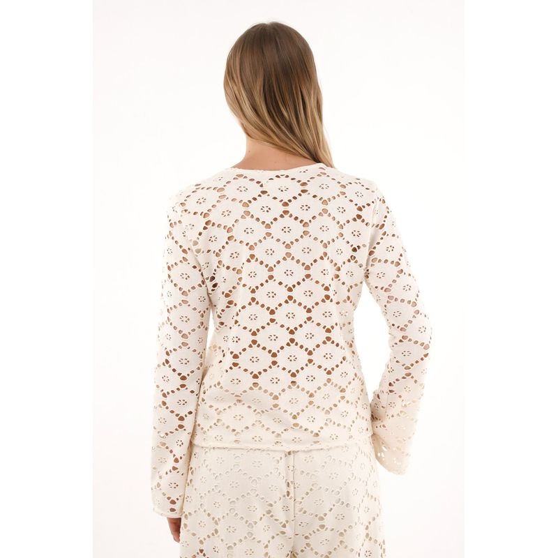 Su silueta cómoda y el tejido de punto con detalles desagujados le dan un aire ligero y femenino, perfecto para un look fresco y delicado.