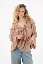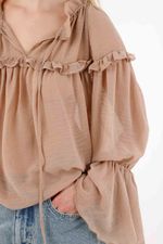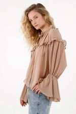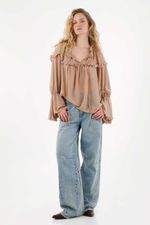 Esta camisa es pura delicadeza y movimiento. Los recogidos y boleros en mangas y escote le dan un aire romántico y etéreo, perfecto para outfits de día o de noche. Llévala con pantalones y botines para un look sofisticado, o con jeans y accesorios minimalistas para un estilo casual chic lleno de personalidad.