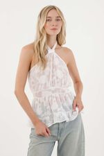 Hecho en tela chifón, ligera y translúcida, que suma elegancia y movimiento a cada paso. El cuello halter y los cortes en frente estilizan la figura, mientras que el bolero en ruedo le agrega ese vibe femenino que tanto disfrutas. Perfecta para combinar con pantalones de silueta ajustada o faldas midi en un plan de tarde-noche.