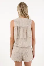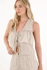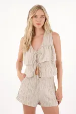 Con una silueta tipo chaleco y tiras que se anudan al frente, esta camisa captura la esencia del verano: liviana, relajada y con un aire romántico que se adapta a cualquier ocasión. Perfecta para usar en set con su short a juego o combinar con denim de tiro alto para lograr un look casual con un toque chic.