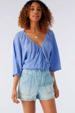 CAMISA INDA MUJER! Este camisa en ojalillo azul de sialueta amplia, manga 3/4 y cuello en V es la pieza perfecta para verte hermosa en cualquier ocasión. Con broche tipo gancho a la altura del pecho, en el escote y elástico en la cintura para mayor comodidad ajuste, esta camisa es un imprescindible en tu armario esta temporada de verano.
