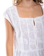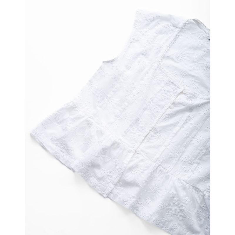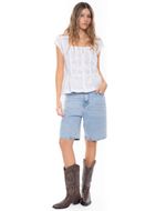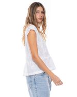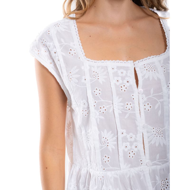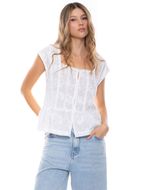 Camisa de manga corta para mujer, diseñada con aplicación de guipur en el escote que aporta un acabado elegante y sofisticado. Su diseño resalta la feminidad de la prenda, incorporando un detalle decorativo que eleva su apariencia sin perder funcionalidad.