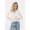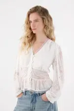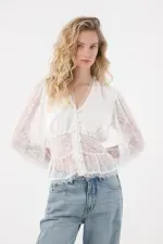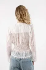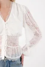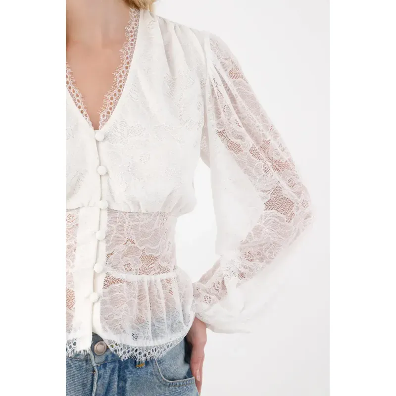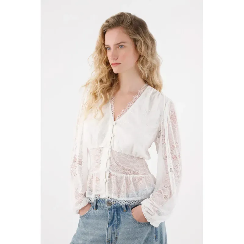 Confeccionada en encaje crudo, cuenta con botones frontales, manga larga con elástico en el puño que ajustan suavemente, y un corte inferior que favorece la silueta.