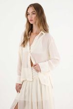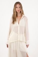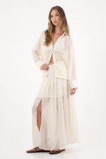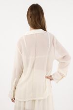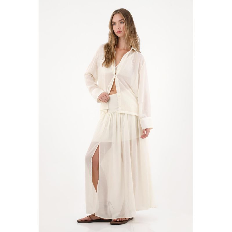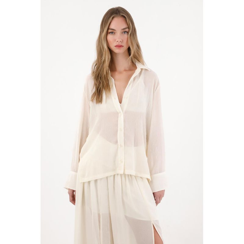 Esta camisa larga captura la esencia del nuevo boho contemporáneo: relajada, etérea y con un aire sofisticado. Su textura sutil y la transparencia delicada le dan un toque sensual y liviano, ideal para combinar con la falda a juego en un set que eleva lo cotidiano.
