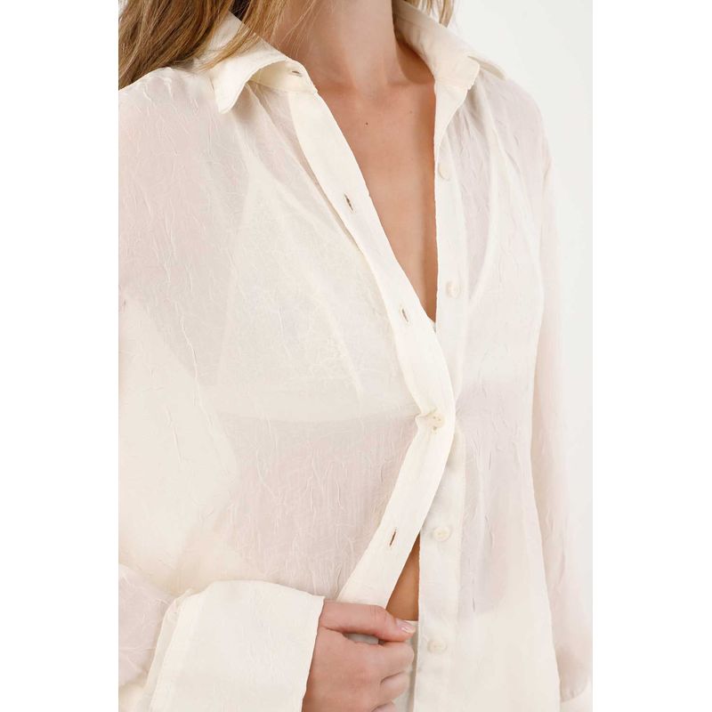 Confeccionada en una tela fluida con textura y transparencias, cuenta con cuello camisero, manga larga, perilla con botones y aberturas laterales que aportan libertad y movimiento.