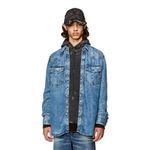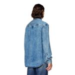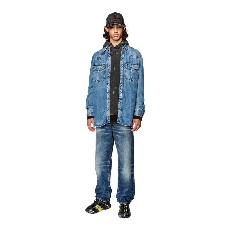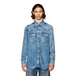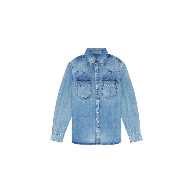 Esta camisa de manga larga para hombre tiene un corte recto, detalles típicos del oeste y botones metálicos a presión. el logotipo d rojo está bordado en el bolsillo del pecho. está Confeccionado en tejido vaquero tencel™ lyocell con una textura suave y ligera en un tono azul medio matizado. El modelo viste una talla l y mide 182 cm