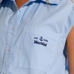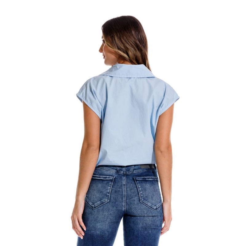 Camisa en algodón manga sisa de botones. Efecto lavado azul claro con bolsillos y bordado en delantero.