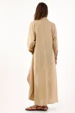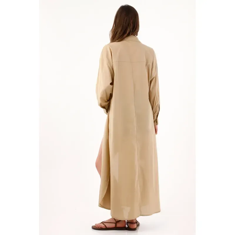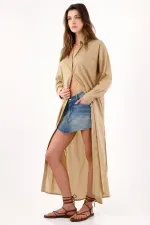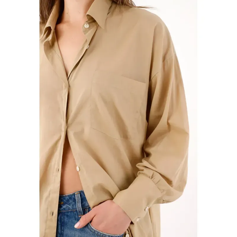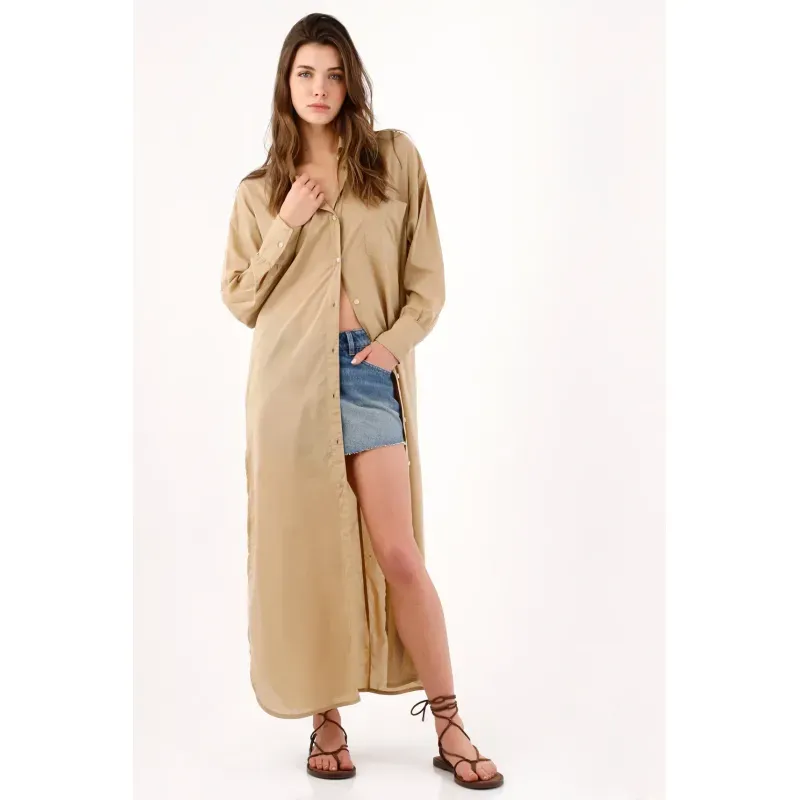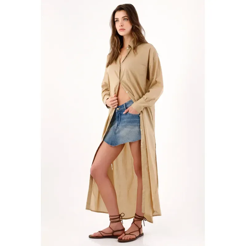 La energía está en los laterales: sus aberturas profundas crean un paso fluido y aireado que hace que cada giro cuente. La silueta oversize aporta ese toque relajado que pide la ciudad, mientras el algodón beige mantiene el look limpio y atemporal. La botonadura completa permite llevarla cerrada o abierta según el mood, el bolsillo en pecho suma actitud utilitaria y los puños abotonados invitan a remangar y jugar con el volumen.
