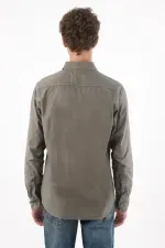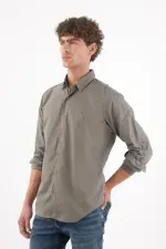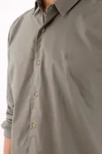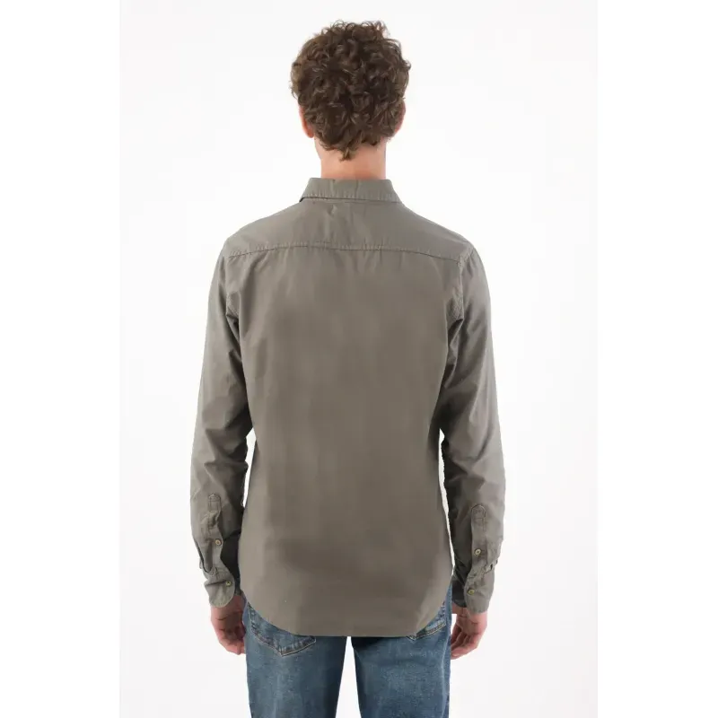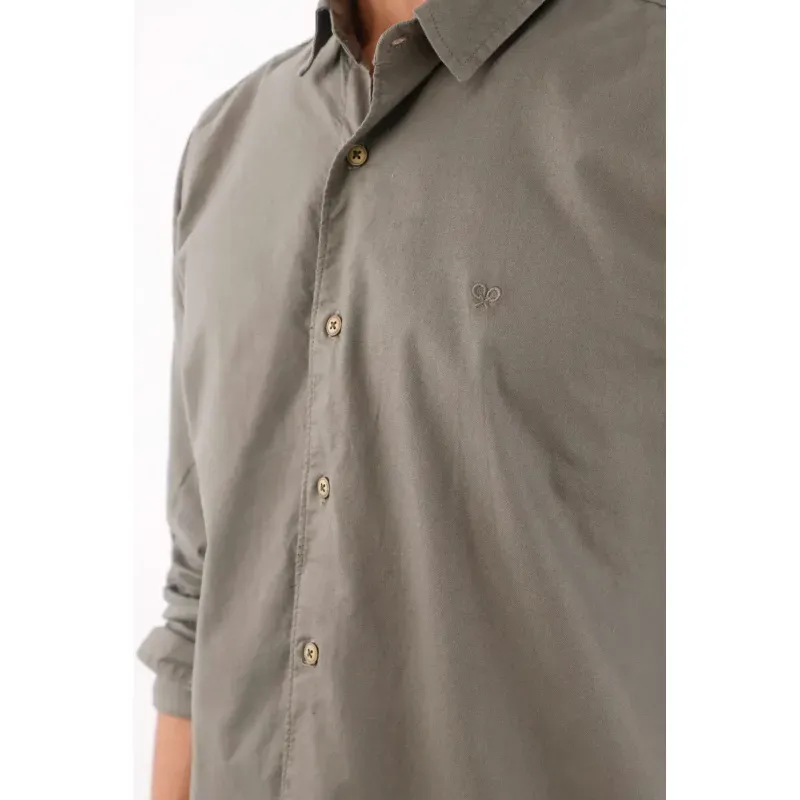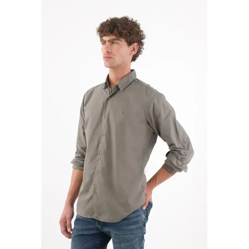 Camisa de algodón 100% en verde oliva que se mueve entre lo casual y lo pulido. Los botones en contraste suman un toque cálido y urbano; el logo bordado tonal en el pecho mantiene la identidad en clave discreta; el bajo redondeado y el cuello clásico dibujan una silueta limpia que favorece y se adapta al ritmo de ciudad. Manga larga para uso versátil y fácil de combinar.