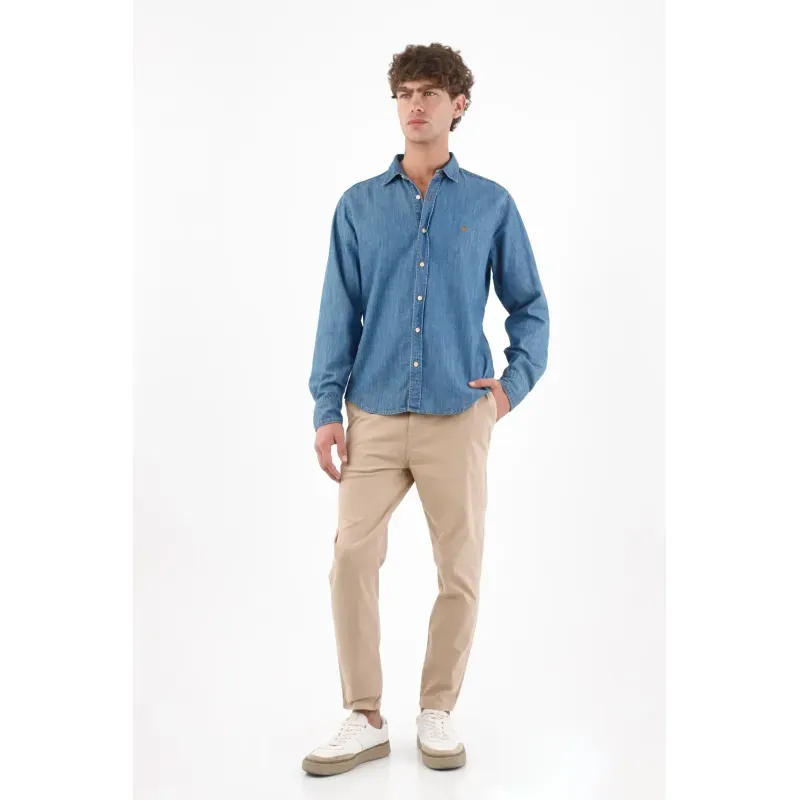 Fit & Styling Llévala en fit relajado, mangas dobladas y el cuello abierto para un aire fresco. Combínala con bermuda blanca o un pantalón chino claro para destacar el azul de esta camisa a rayas hombre y mantener una vibra limpia y contemporánea en manga larga.