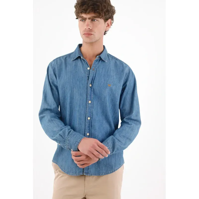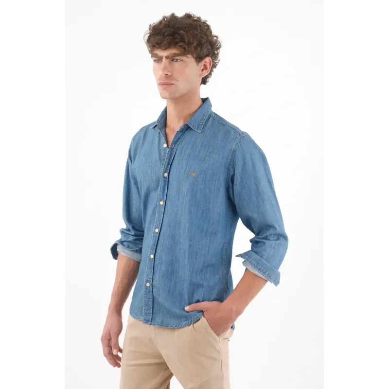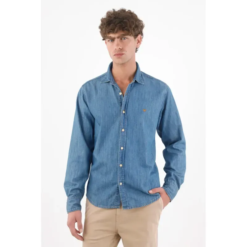 Rayas que estilizan, actitud que se nota. Esta camisa de manga larga suma energía urbana con sus micro rayas azul y blanco que alargan visualmente la figura. El poliéster luce un relieve sutil que aporta textura y un aspecto ligero. Los botones color caramelo añaden un contraste cálido y moderno, mientras el pequeño bordado en el pecho aporta identidad sin exceso. El bajo curvo y el fit relajado permiten llevarla por fuera con caída natural, perfecta para moverse entre la ciudad y planes casuales.