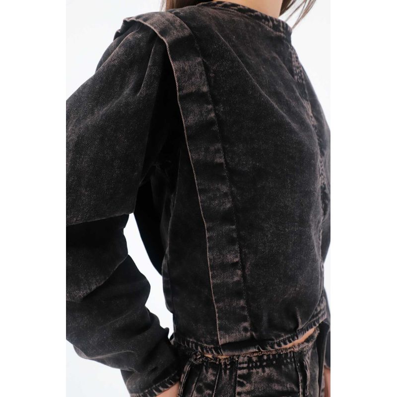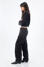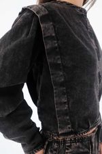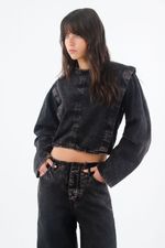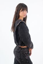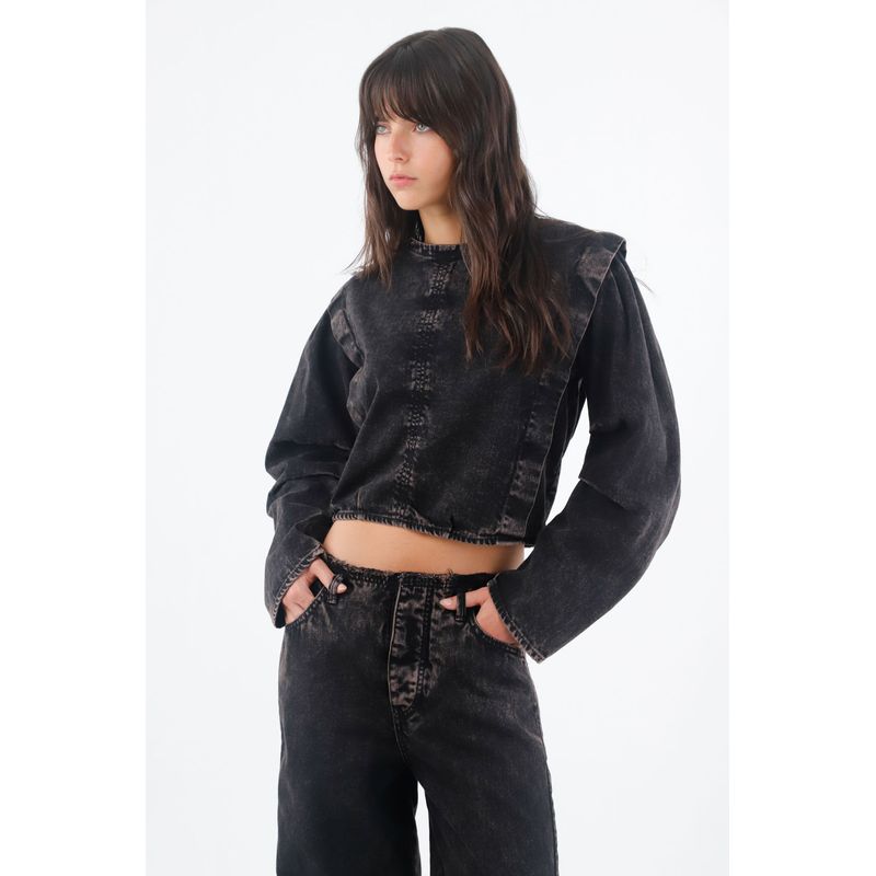 Hombros con actitud, mirada urbana instantánea. Una camisa crop en algodón 100% con efecto negro lavado que suma textura y vibra vintage. Los hombros marcados con paneles geométricos le dan estructura y presencia sin esfuerzo; el bajo deshilachado aporta un toque crudo y cool; la costura central al frente dibuja la silueta y estiliza visualmente. Las mangas largas y amplias añaden movimiento y una comodidad relajada, perfecta para tu ritmo de ciudad.