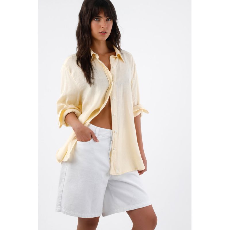 Fit & Styling Llévala como camisa de lino mujer oversize: deja dos botones sueltos, arremanga y combínala con una bermuda blanca amplia y un top ceñido en tono claro para un juego de proporciones moderno y fresco. Un uniforme de ciudad para días cálidos y planes creativos.