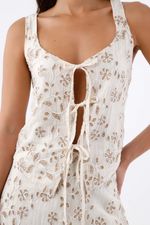 Esta camisa sin mangas captura la frescura de la ciudad con su bordado floral calado sobre tono marfil: el relieve aporta textura visual y una vibra artesanal moderna. La abertura central unida por lazos escalonados dibuja una línea vertical que estiliza y suma un toque juguetón. El escote redondeado con sisa amplia libera hombros y alarga el cuello, mientras el tejido en lyocell muestra un acabado de apariencia limpia. Incluye forro de viscosa en el cuerpo para una sensación más pulida.