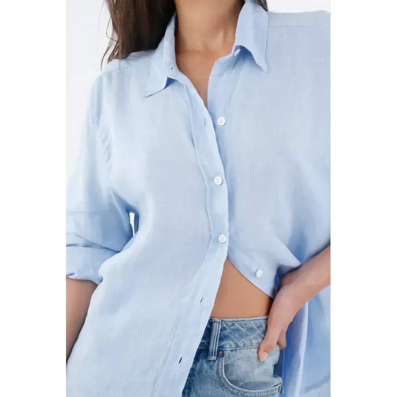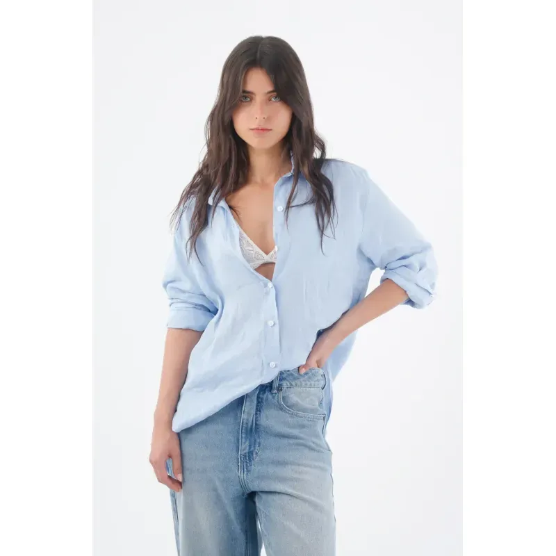 Confeccionada en 100% lino, su trama natural se percibe a simple vista y aporta una caída ligera que acompaña el movimiento. El azul cielo suma luz y una sensación limpia que funciona todo el día. La botonadura blanca y el cuello clásico crean un frente minimal que conecta con el ADN urbano de TNS. La silueta relajada de manga larga permite jugar con el abotonado y el arremangado para un efecto despreocupado, esa camisa de lino mujer que se adapta a tu ritmo.