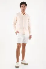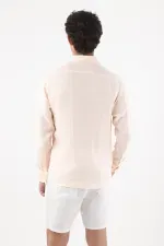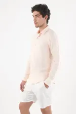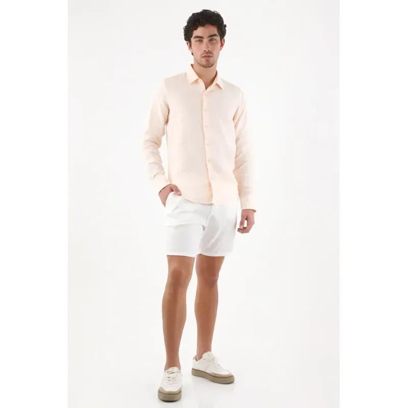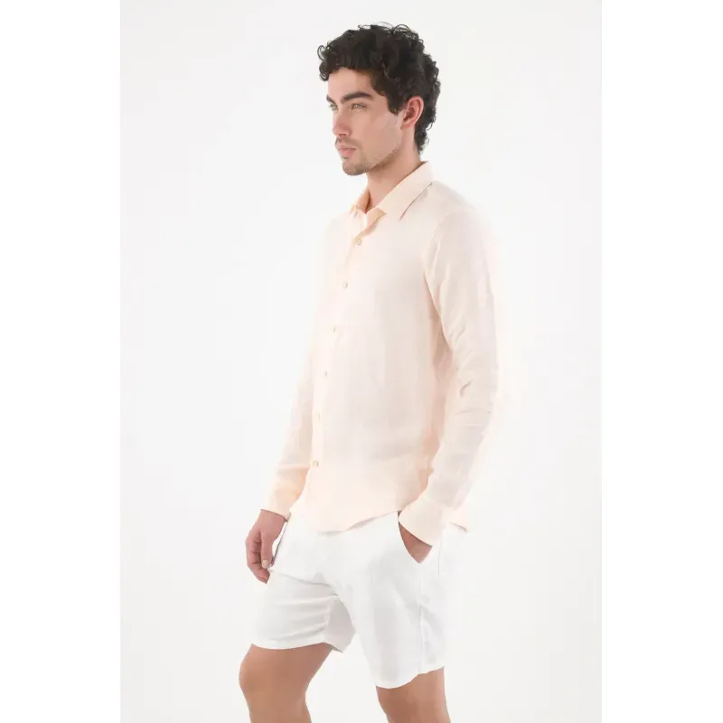 Una camisa de lino 100% que respira ciudad con vibra natural. El tono durazno suaviza el look y suma luz, mientras los botones al tono mantienen la estética limpia y moderna. El cuello clásico ordena la silueta y el ruedo curvo permite llevarla por fuera sin perder estructura. Manga larga para jugar con el gesto: completa o con un doblez ligero según el mood del día. Ideal si buscas una camisa lino hombre versátil y con carácter relajado.