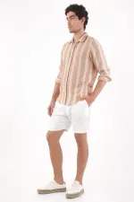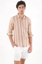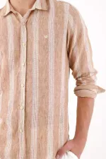 Rayas que estilizan sin esfuerzo. Esta camisa manga larga para hombre conecta vibra de ciudad y frescura relajada con sus rayas verticales en beige arena y blanco, de textura jaspeada que aporta un aire natural. El corte regular se ve limpio y cómodo, la botonadura frontal y el cuello clásico ordenan el conjunto, mientras el mini logo al pecho añade identidad sutil. El bajo redondeado permite llevarla por fuera sin perder proporción. Confeccionada en poliéster, se integra fácil a tu rotación diaria como camisa de rayas verticales y camisa casual beige que combina con todo.