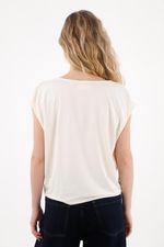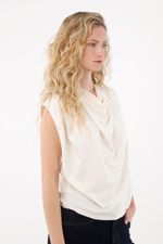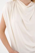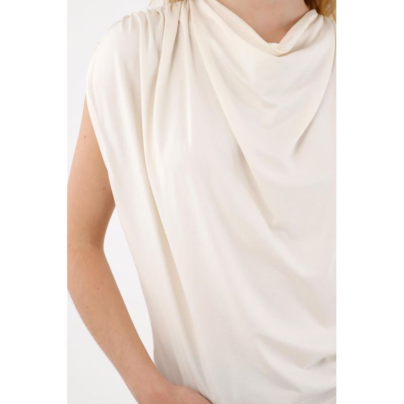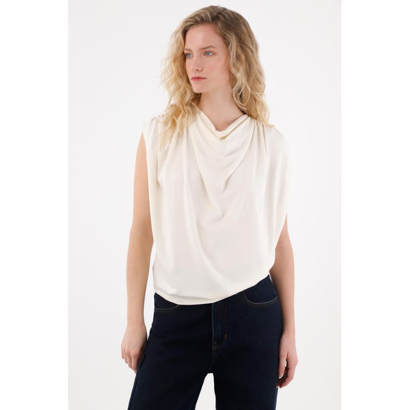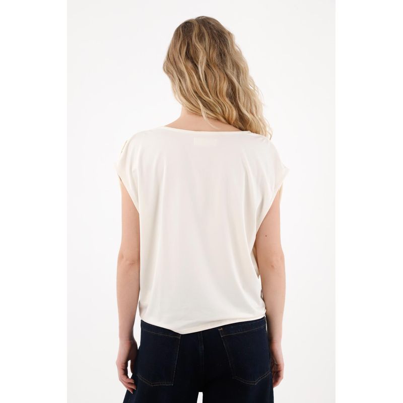 Esta tshirt manga sisa está confeccionada en una tela de tacto frío que se adapta delicadamente a tu cuerpo, brindando una sensación ligera, suave y muy agradable para los días cálidos o para looks casuales con un toque moderno. Su escote drapeado aporta un detalle femenino que estiliza, realza y suma un aire sofisticado sin esfuerzo.