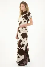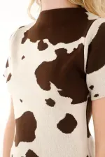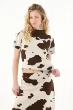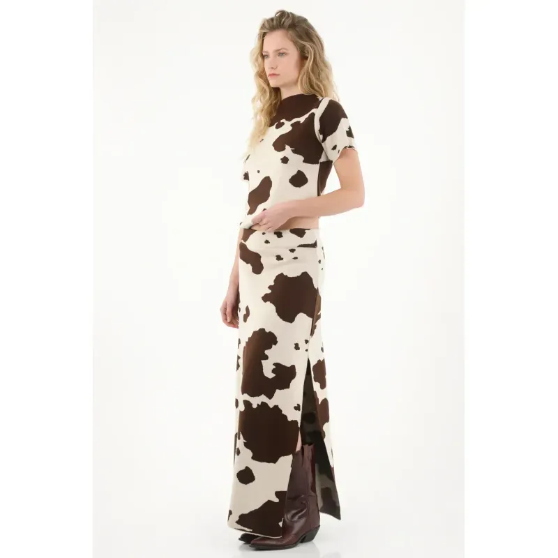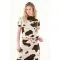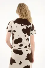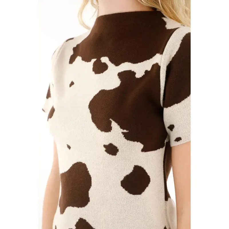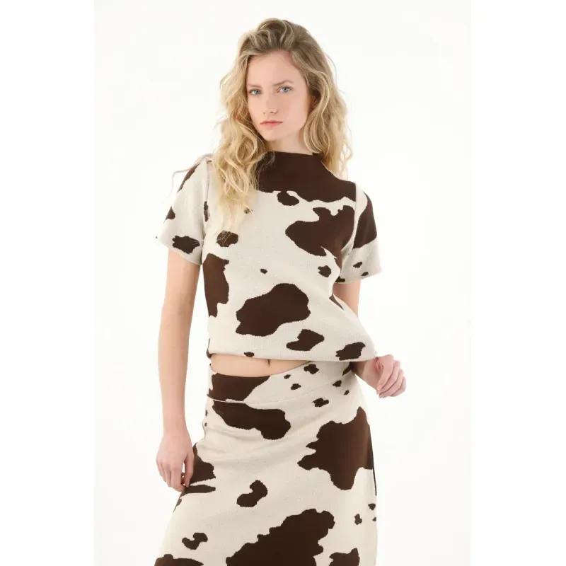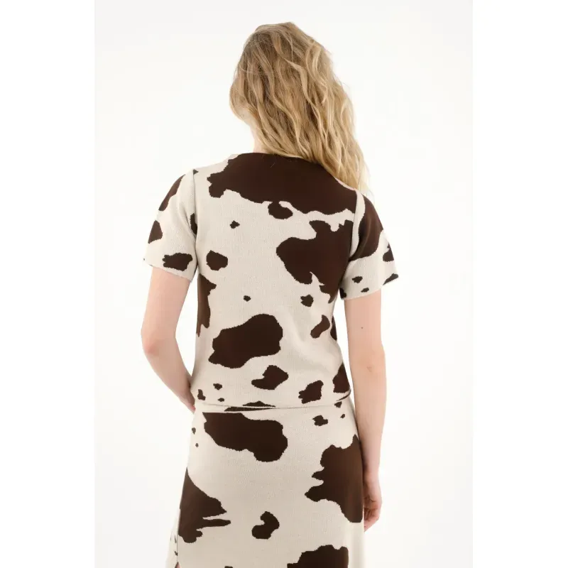 Esta camiseta para mujer cuenta con un cuello redondo clásico y manga corta, ideales para mantener la comodidad sin perder estilo. Su protagonista es el estampado de vaca, un diseño audaz y actual que le da un toque diferente y juguetón a cualquier outfit. Su silueta versátil permite combinarla fácilmente, ya sea en looks relajados o más propositivos.