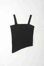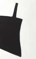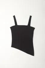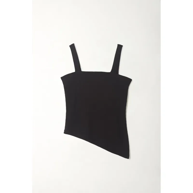Con una silueta ajustada y tiras anchas que enmarcan los hombros, esta camiseta reinventa lo básico con un toque moderno: su ruedo asimétrico en diagonal aporta dinamismo y una dosis sutil de actitud.