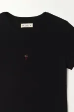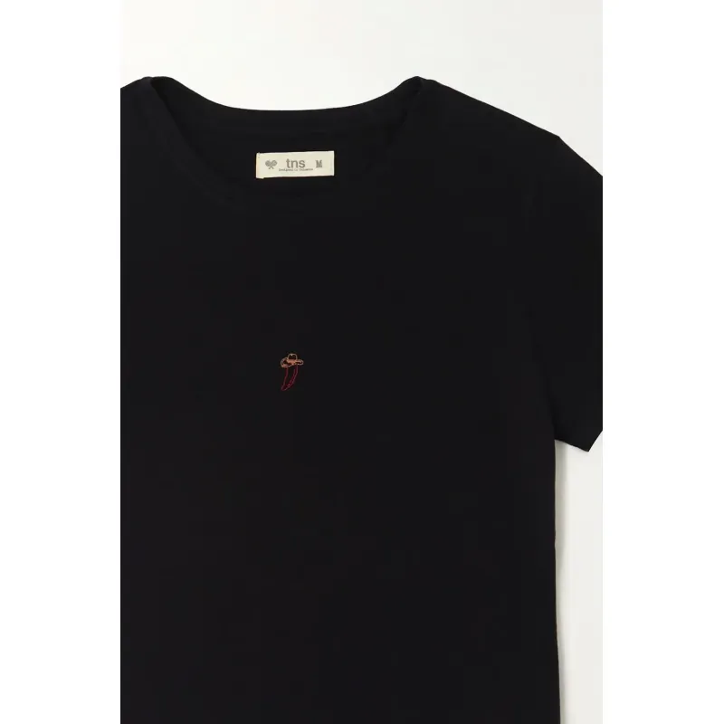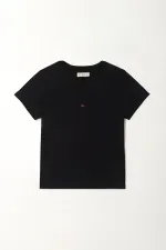 Esta camiseta de manga corta combina simplicidad y estilo en una silueta clásica que nunca falla. Su cuello redondo y su corte cómodo la convierten en una prenda versátil para usar con jeans, shorts o pantalones relajados. El estampado localizado aporta un toque moderno que eleva cualquier outfit sin perder la esencia minimalista.