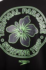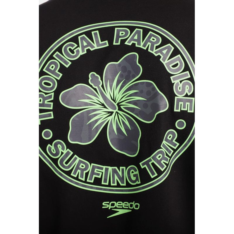 Esta camiseta manga corta negra está fabricada con los más altos estándares de calidad en algodón 100% para brindar comodidad y frescura. Cuenta con estampado circular Tropical Paradaise, de flor Hibis Speedo en verde neón y gris en la parte trasera, y en el frente tiene nuestro icónico logo Speedo pequeño, un diseño que podrás combinar facilmente con otras prendas.