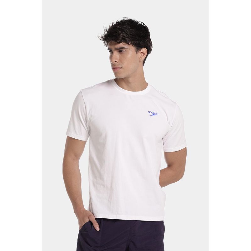 Esta camiseta manga corta blanca está fabricada con los más altos estándares de calidad en algodón 100% para brindar comodidad y frescura. Cuenta con estampado Speedo azul de faro en la parte trasera, y logo Speedo pequeño en la parte superior delantera, un diseño que podrás combinar con facilidad con otras prendas a donde vayas.