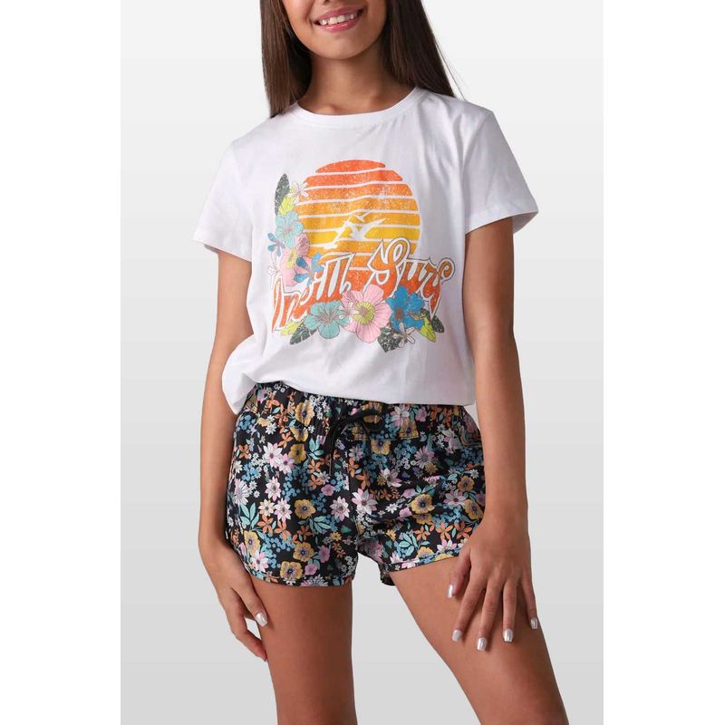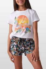 camiseta playera STANDART FIT SUNRISE para niña de 6 a 14 años. Con estampado de atardecer floreado en la parte delantera, una camiseta cómoda y divertiva para usar en la playa o en su día a día en la ciudad.