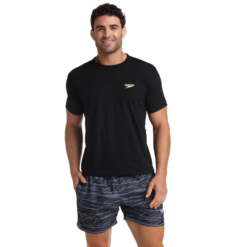 Esta camiseta manga corta negra está fabricada con los más altos estándares de calidad en algodón 100% para brindar comodidad y frescura. Cuenta con estampado Speedo en colores azul y amarillos Speedo en tonos vivos en la parte trasera, y en el frente tiene nuestro icónico logo Speedo pequeño, un diseño que podrás combinar facilmente con otras prendas.