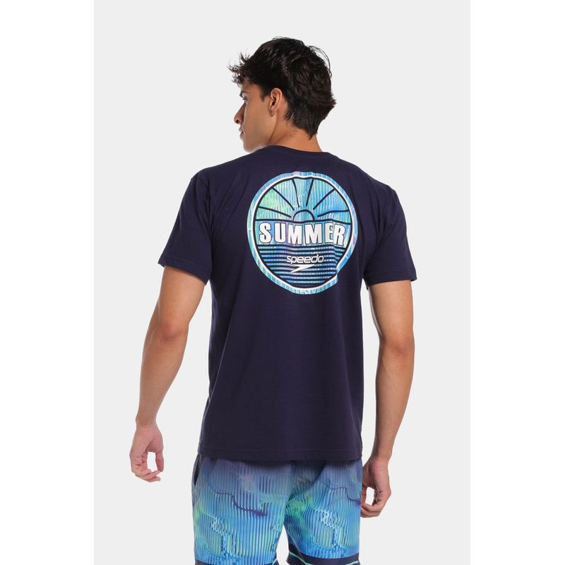 Esta camiseta manga corta azul está fabricada con los más altos estándares de calidad en algodón para brindar comodidad y frescura. Cuenta con estampado circular Summer speedo en la parte trasera, y logo Speedo pequeño en la parte superior delantera, un diseño que podrás combinar facilmente con otras prendas.