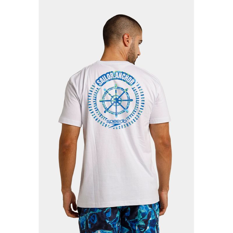 Esta camiseta manga corta blanca está fabricada con los más altos estándares de calidad en algodón 100% para brindar comodidad y frescura. Cuenta con estampado circular Speedo azul de timón en la parte trasera, y logo Speedo pequeño en la parte superior delantera, un diseño que podrás combinar con facilidad con otras prendas a donde vayas.