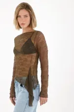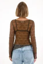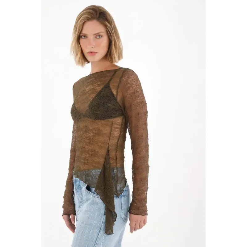 ¡Un guiño audaz a la feminidad moderna! Esta camiseta en blonda con transparencias es la pieza que redefine el estilo boho con un aire actual y sofisticado.