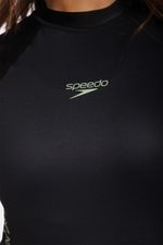 camiseta manga larga de Protección Solar negra, cuenta con logo Speedo pequeño en la parte delantera y diseño Speedo Boomerangg en los laterales de la cintura en tonos verdes. Incluye