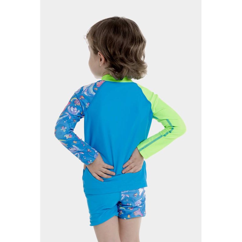 Una camiseta manga larga azul y verde con logo Speedo, y hermoso diseño de animales marinos bajo el agua, que incluye unos hermosas ballenas bordados en alto relieve con apliques.