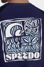 camiseta manga larga de protección solar azul oscura con estampado pop-art tropical abstracto blanco y en tonos azules, delimitado con un marco blanco Speedo en la parte trasera, y logo Speedo pequeño en el frente, que le brindan un diseño único y diferenciado. Cuenta