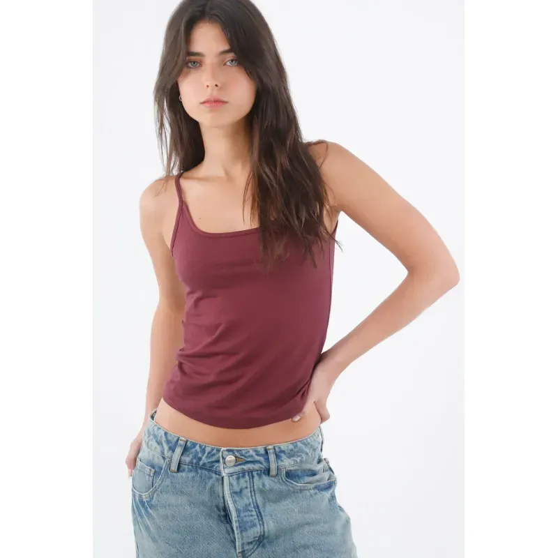 Esta camiseta de tirantes concentra el ADN urbano de TNS en una silueta limpia: tirantes finos y escote redondeado que estilizan cuello y hombros, con ribete tonal para un acabado pulcro. El punto combina 47% algodón y 47% viscosa con 6% elastano, logrando un fit ceñido que acompaña el cuerpo sin distraer. El tono bordó suma profundidad y personalidad, ideal para darle identidad a looks neutros o funcionar como capa base con actitud.