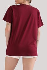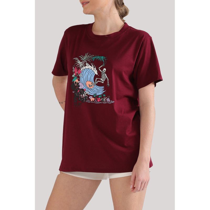 OVERSIZE SKELETON SURF para mujer, tiene un estampado de flores en la parte delantera y una composición de olas y una calavera surfeando. Este diseño de color vinotinto, te dará un look moderno tanto para la playa como para la ciudad.