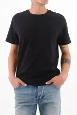 Fit & Styling Llévala con jeans azul claro de corte recto y una sobrecamisa abierta en tonos neutros; mete ligeramente el delantero para marcar la silueta y deja las mangas relajadas. Una camiseta negra de hombre en algodón que funciona de la mañana a la noche con vibra casual contemporánea.