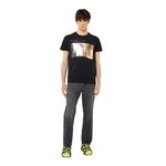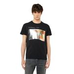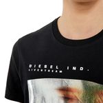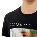 Camiseta entallada para hombre de tejido de algodón. Este modelo con gráfico muestra una fotografía de una cara borrosa estampada en una lámina plateada; el diseño está firmado con las palabras ‘Diesel Ind. Livestream’. El modelo viste una talla L y mide 182 cm 100%Algodón País origen: Vietnam