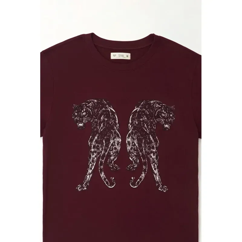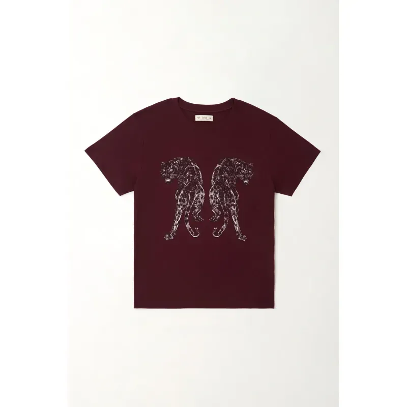 Dos panteras, una vibra poderosa. Un estampado espejo en el pecho despierta actitud instantánea sobre un vinotinto profundo: es la cuota justa de rebeldía para el día a día. El jersey de algodón 99% con 1% elastano se siente suave y se mueve contigo, perfecto para jornadas largas en la ciudad. El cuello redondo acanalado mantiene la forma tras cada lavado y el fit regular dibuja una silueta limpia y fácil de combinar. El efecto ligeramente desgastado del gráfico suma textura y ese guiño artístico que diferencia tu look.