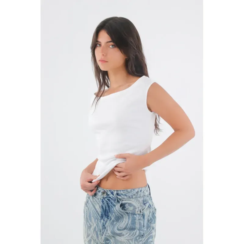 Hombros a la vista, actitud al instante. Esta camiseta blanca reinterpreta lo esencial con un escote tipo barco que cae sutil y deja los hombros al descubierto: una camiseta hombros descubiertos para mujer que respira ciudad. El tejido acanalado en algodón 93% y elastano 7% crea un fit ajustado que acompaña el movimiento y perfila la silueta. El blanco nítido multiplica combinaciones y el largo a la cadera permite usarla por dentro o al natural. Una camiseta algodón blanco con aire limpio y contemporáneo.