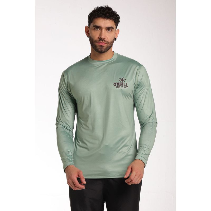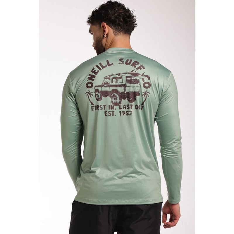 Esta camiseta manga larga verde de protección solar con estampado O'Neill Surf Co café de Jeep en la parte trasera y pequeño en la parte frontal, le da un toque de estilo a tus días mientras te protege del sol.