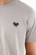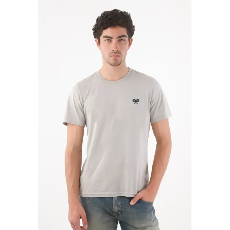Match point de estilo minimal. Gris claro, líneas limpias y un guiño sutil: el mini bordado de raquetas en el pecho suma actitud deportiva sin ruido. La silueta recta con cuello redondo mantiene la vibra relajada y versátil, mientras el tejido de algodón luce natural y fácil de combinar para el día a día urbano.