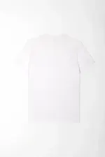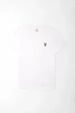 Llévala en fit regular, ligeramente suelta, fajada en unos jeans rectos azul medio y suma una sobrecamisa abierta en tono neutro; el gráfico queda en primer plano y el look se ve fresco y urbano. Una camiseta de algodón blanca pensada para tu ritmo diario.